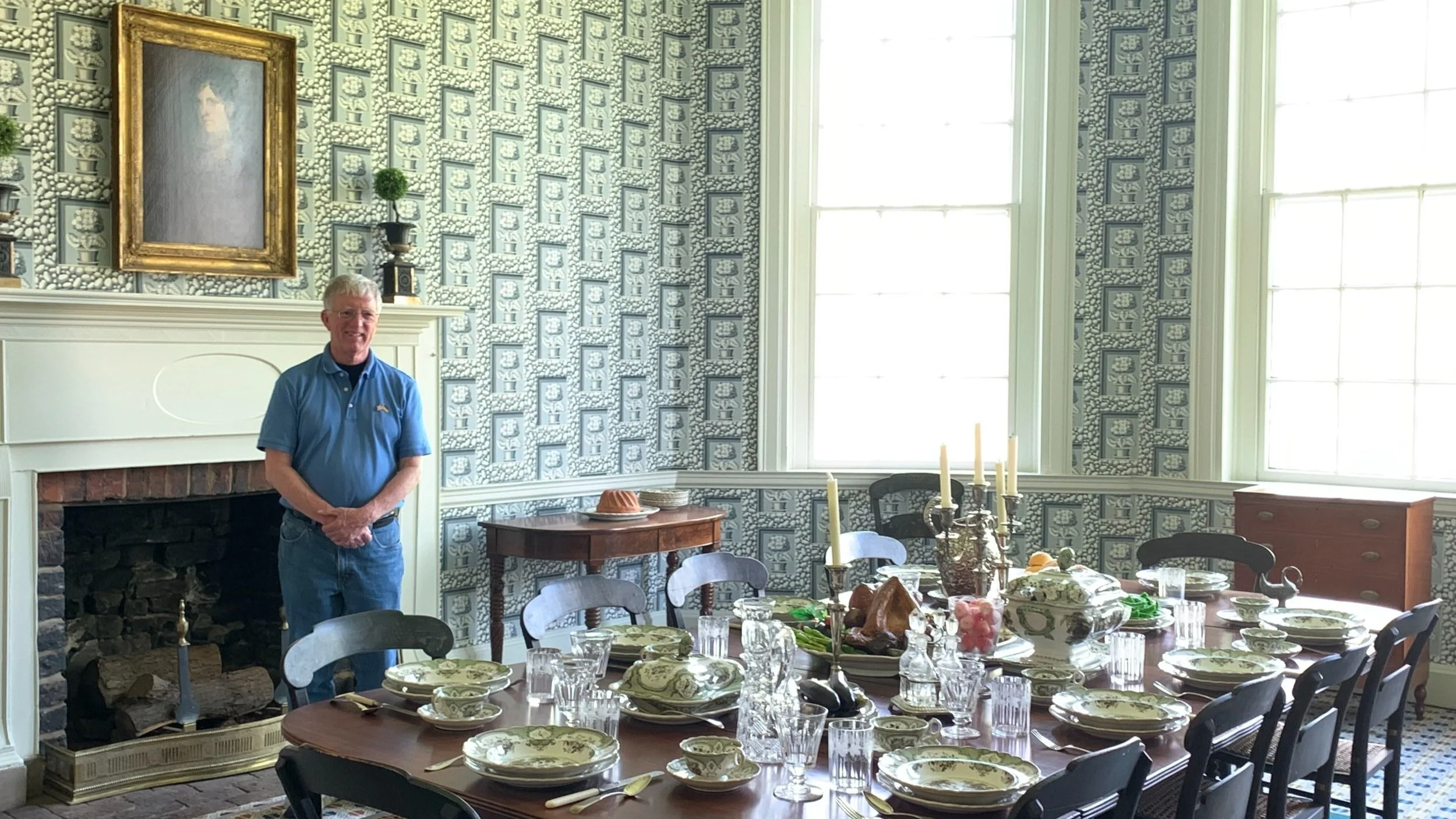 (The photograph shows David Green standing in the formal dining room of the Main House at Farmington Plantation, where Abraham Lincoln dined with members of the Speed family in 1841.)